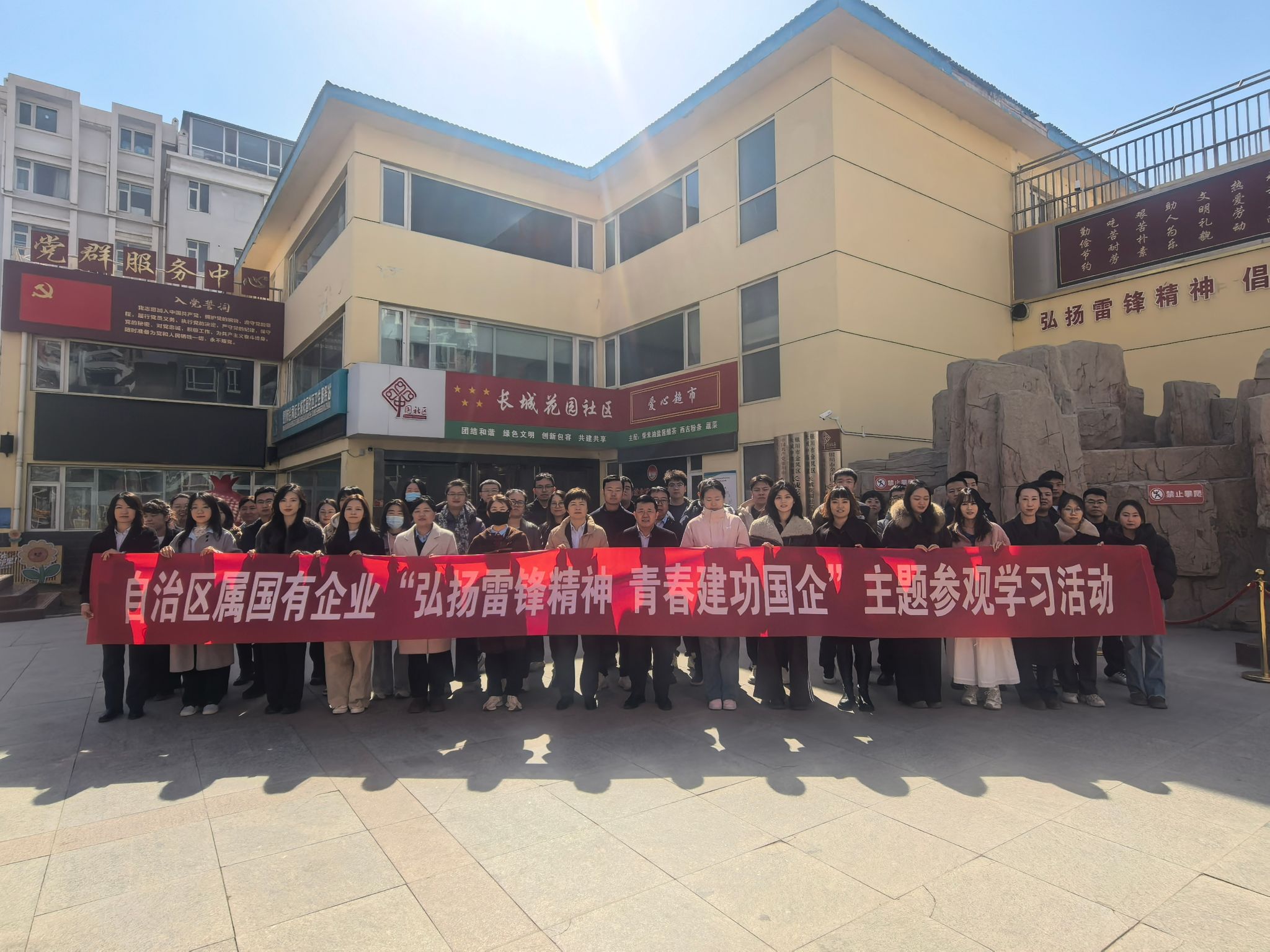 为自觉践行雷锋精神,3月18日,由自治区属国有企业团工委主导,宁夏银行团委、宁夏国有资产投资控股集团团委牵头组织,联合黄河出版传媒集团、宁夏农垦集团等9家区属国企50余名党员、团员青年走进长城花园社区,共同开展“弘扬雷锋精神 青春建功国企”主题参观学习活动。